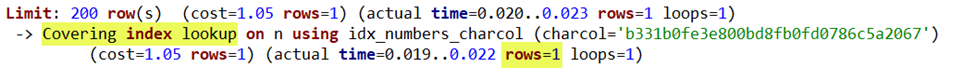 When I run the same query as before, along with the actual execution plan, we see the number of rows touched is only one this time – a very significant performance improvement.