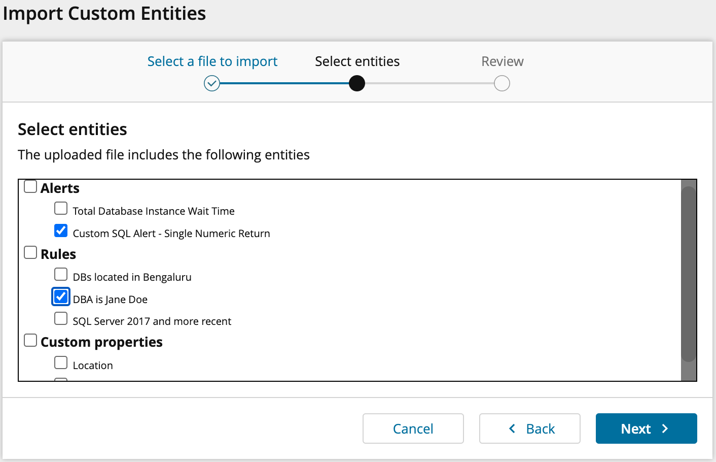 You can now specify to only import a subset of your exported configuration entities. The import wizard displays a list of the alerts, rules, and custom properties that can be imported. Clear the checkbox next to any entity you don't want to import.