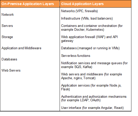 Imagine a scenario in which an enterprise migrates from an on-premises to a cloud-based environment. The following table compares the on-premises layers with the cloud layers: