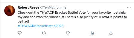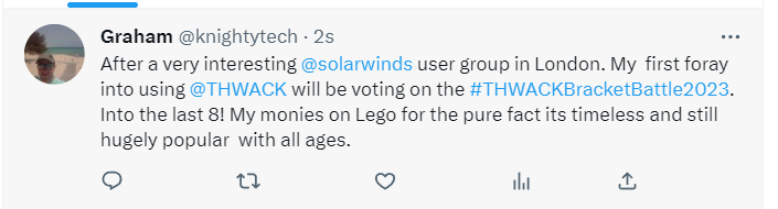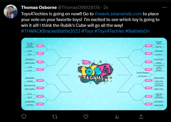 We’d love to see your campaigns for your favorite toys with your friends/followers. Feel free to tag us in your social posts with #THWACKBracketBattle2023. Post a screenshot of your post in the comments here to earn an additional 300 THWACK points and a special goody from the THWACK store.