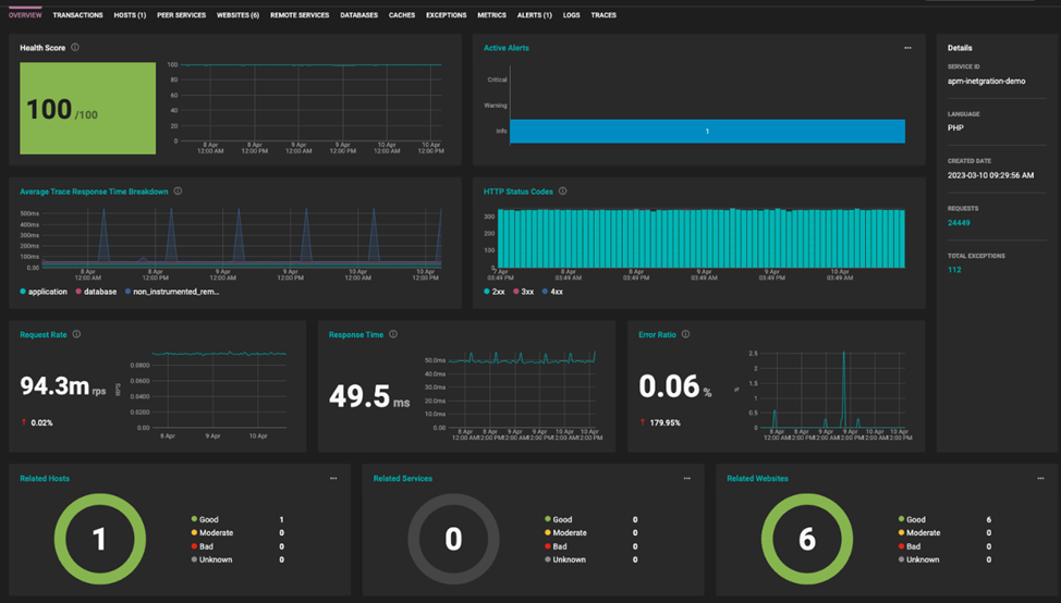 For server-side latency, SolarWinds® Observability can be a good way to monitor response time. You can easily see spikes in response time on the dashboard or in alerts. To help troubleshoot issues, it is designed to provide the breakdown by backend service in your distributed systems monitoring and can even trace individual requests through your stack.