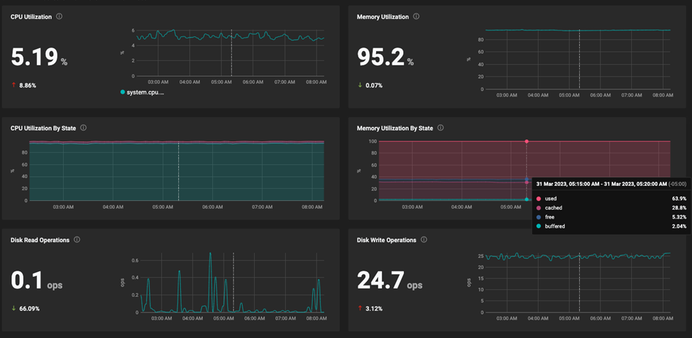 Reaching the saturation limit can affect your service in different ways. For example, when the CPU is full it can result in delayed responses, full storage space can result in failure on disk writes, and network saturation can result in dropped packets. The SolarWinds Observability dashboards and alerts can help you keep an eye on these resources and help you proactively adjust capacity before they become saturated.