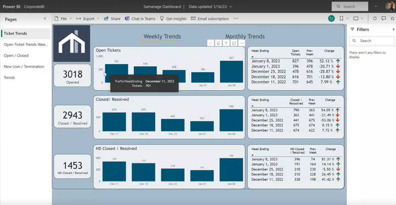Integration with Power BI, the Microsoft® interactive data visualization solution, was a must to achieve full visibility into the ticket volume and data.