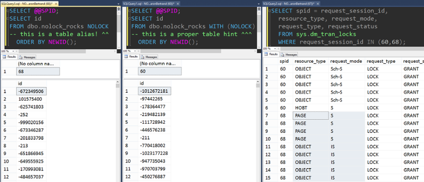 On the left, session 68 just used FROM dbo.tablename NOLOCK