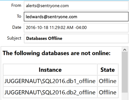 On one of the instances I'm actively monitoring, I set two databases to offline, and let the condition evaluate. Here is a portion of the email I received: