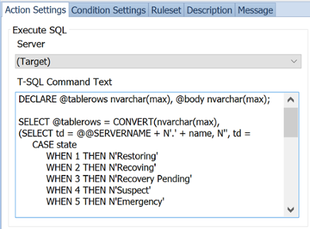 Some customers want a message that's easier to digest - a customized subject, an HTML table with the results, or the removal of some of the other details (such as the condition statement that led to the alert firing). For this, we can use an Execute SQL action. In order to get there, the initial query in the condition can be much simpler - we will need to trigger a subsequent query if any databases are not online (it could also use an EXISTS
