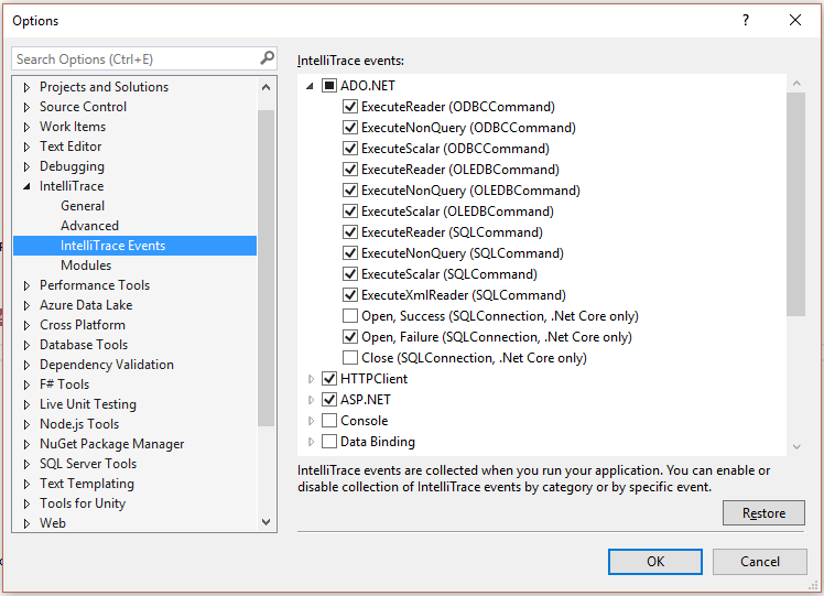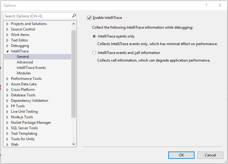 That isn't all, though. I also want to use a Visual Studio feature called Intellitrace. I had it turned off (because it slows down debugging) but in this case I really need it because it can show me the query that's being sent from Entity Framework to the Azure SQL Database.