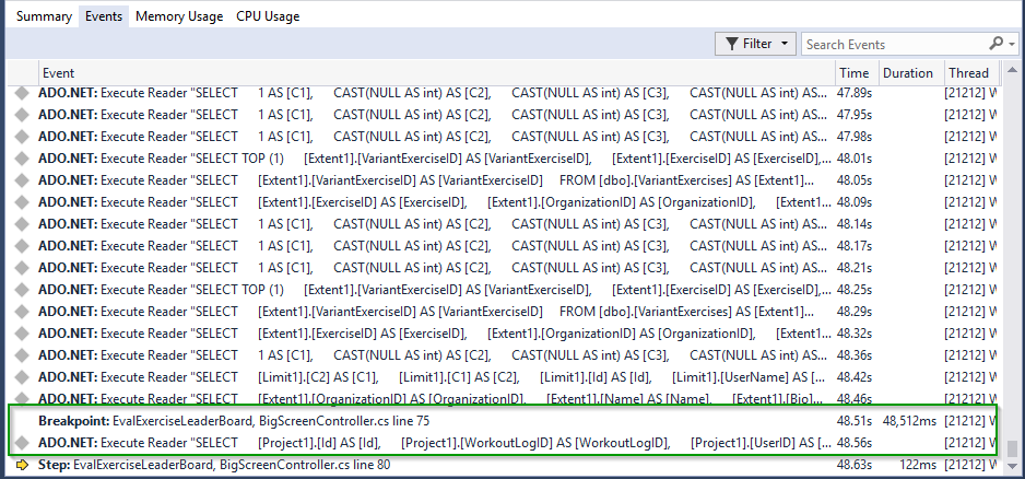 Now, when I debug and navigate to the Big Screen, I'll hit my breakpoint, step over it, and grab my query from the Intellitrace profiler. It will be the next ADO event after the breakpoint.