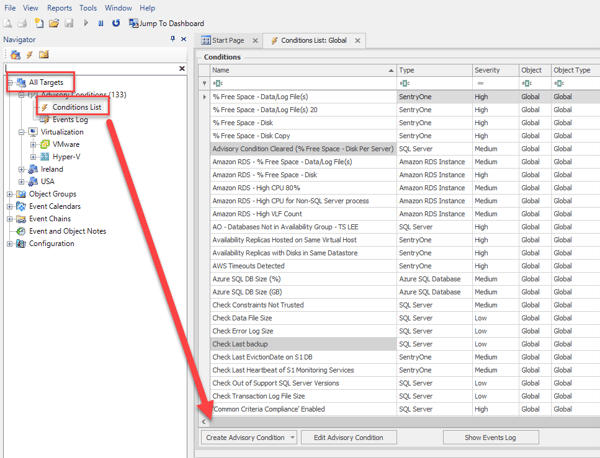 With the queries ready, the last thing you will need to do is set them up in SentryOne. This can be done by either expanding the Advisory Conditions folder in the Navigator pane, double-clicking Conditions List, and then clicking Create Advisory Condition, or by right clicking All Targets and selecting Add Advisory Condition. The screenshot below displays the latter option.