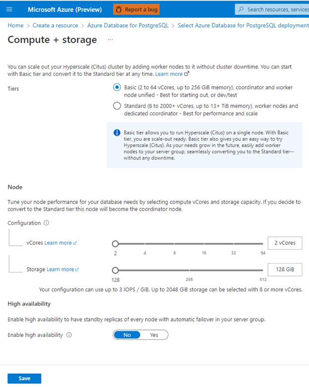 When moving your workload to Production, you should use the Standard tier so you can have multiple worker nodes. When you do this, you’ll need to determine how much compute and storage capacity the coordinator node and each worker node should have. In addition, you’ll need to choose how many worker nodes will be part of your server group. Twenty is the maximum for worker nodes by default, but you can contact Microsoft to increase this if you absolutely need more. There is only a single coordinator node, so you’ll just assign the vCores and Storage for it. You can also enable high availability but remember that will double your costs.