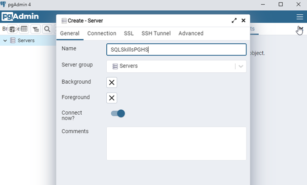 On the “Create Server” General tab, I’ll give this server a friendly name of “SQLSkillsPGHS.”