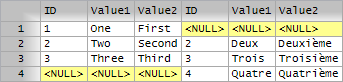 We can see that the columns from the non-matching sides have NULL values, indicating that a match is missing.