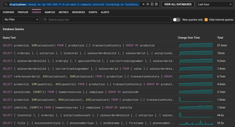 The screenshots below from the SolarWinds® Observability show the database and query performance overview: