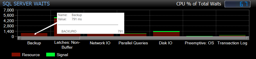 In Sample Mode, hovering over a bar displays the name and total wait time for the wait types of that class, along with the class name and total wait time captured during the sampling period. In the example below, the only Backup Class wait type represented is BACKUPIO, with waits of 791 milliseconds.