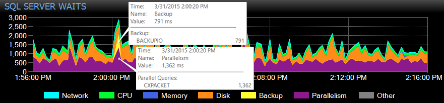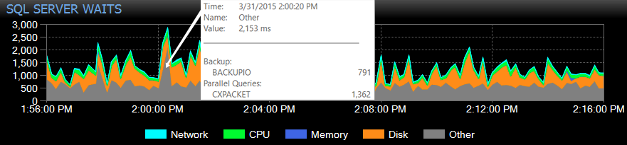 In History Mode, hovering over an area of the chart displays the name and total wait time for all the wait types of that category along with the sample time, category name and total wait time. In the example below, the wait category is "Other", and the specific waits are BACKUPIO and CXPACKET: