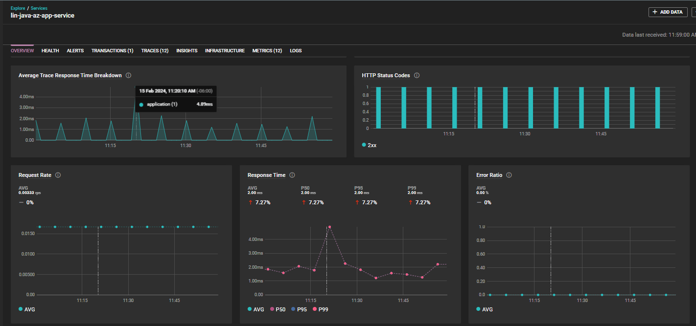 The APM library collects standard metrics for all requests from the application. They help you gain insight into the service’s response time and error rate. Some of the standard metrics include: