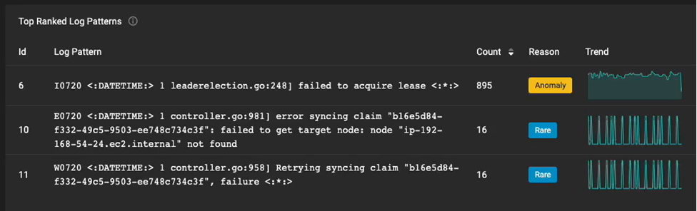 Reason – Log patterns indicate the reason the event pattern was flagged and the pattern's frequency. A single occurrence of an event pattern during the time period is tagged ‘unique,’ while infrequent repetitions are tagged ‘rare,’ and an unusual number of an event pattern is tagged as ‘anomaly.’