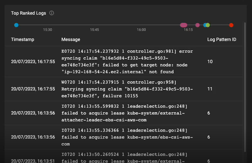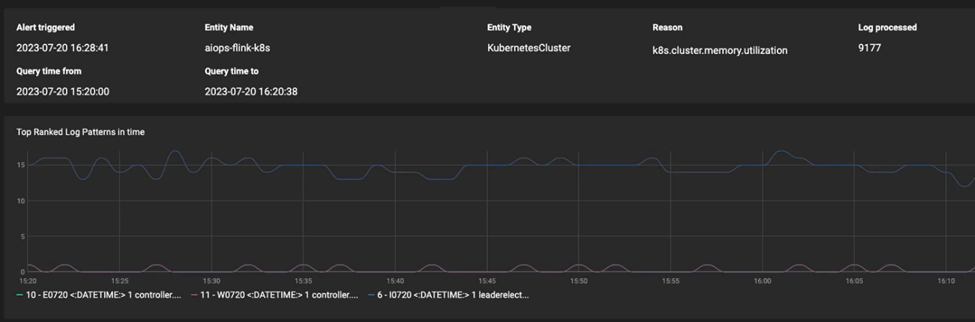 Ranking – Log patterns are ranked from the most to least likely to be related to the alert using an AI Ops/ ML-based analysis of the event messages.