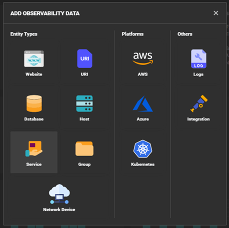 To add a service in SolarWinds Observability select Add Data and select the services option.