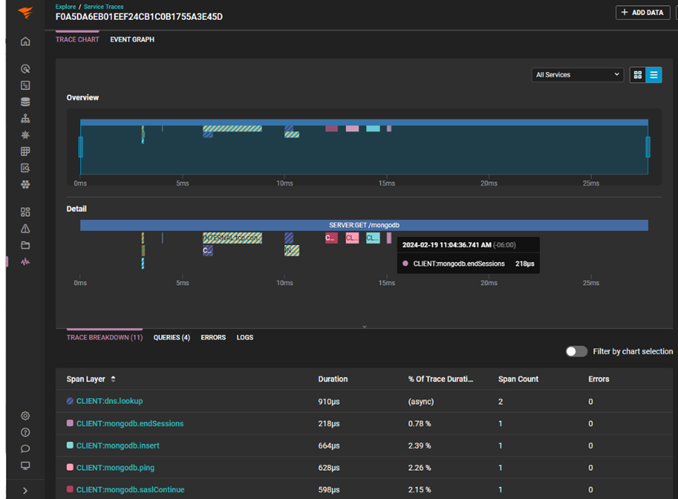 - Follow the path of a single request or query through an application and view detailed information about the transactions, traces, and spans collected by the APM libraries.