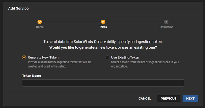 This step also involves selecting an existing API token or creating a new one to use with the new service.