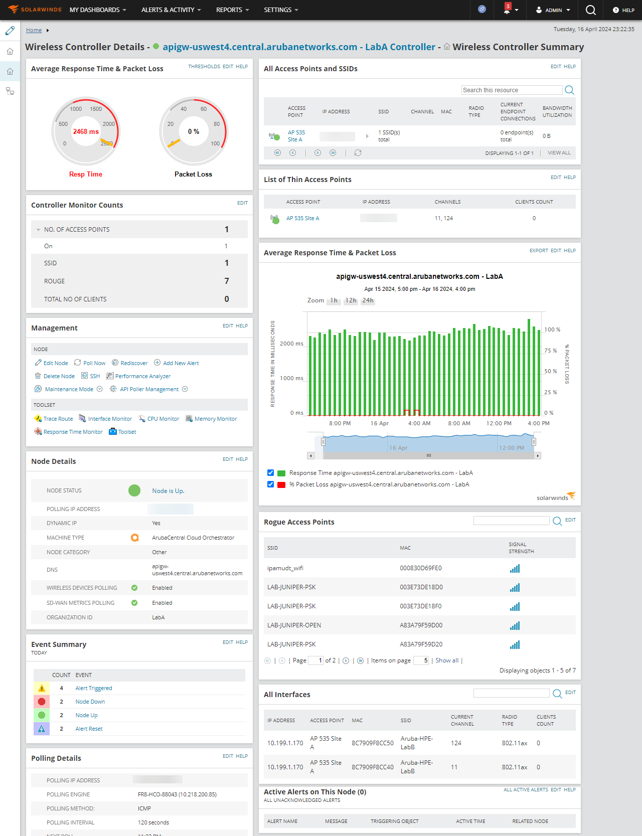 Monitoring Aruba Wireless Controllers via API polling provides access point details, network-wide polling of clients, and details of Rouge access points. Key features include: