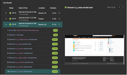 The ability to monitor multi-step transactions holistically ensures critical web flows like account login, shopping cart checkout, and item search work as expected. The availability and responsiveness metrics by step enable you to identify bottlenecks and troubleshoot issues more efficiently. The thumbnail images at each step help you identify where you are in the transaction.