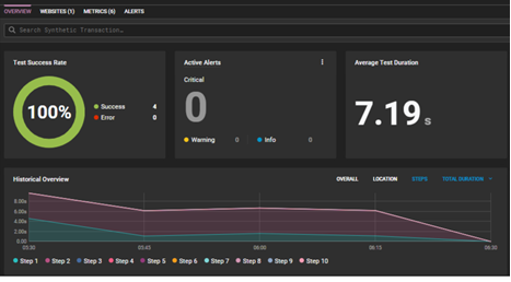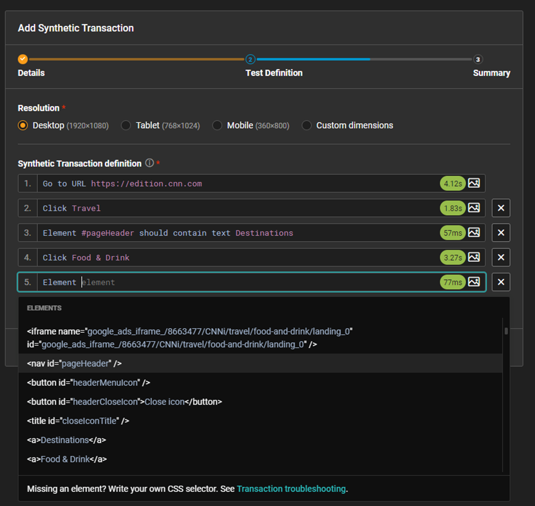 Synthetic transaction monitoring allows you to easily build multi-step tests to replicate a series of user actions and monitor both the speed and availability of the holistic flow as well as each step.