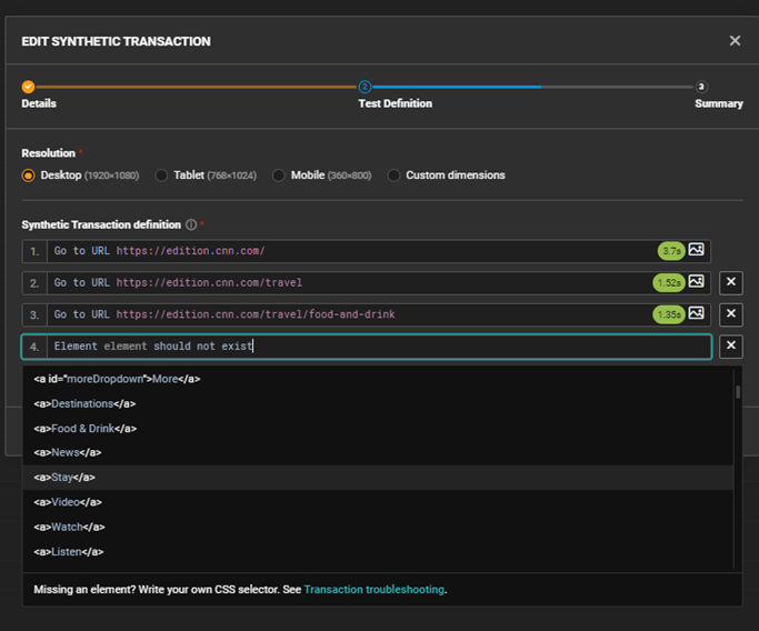 Synthetic transaction monitoring allows you to easily build multi-step tests to replicate a series of user actions and monitor both the speed and availability of the holistic flow as well as each step.