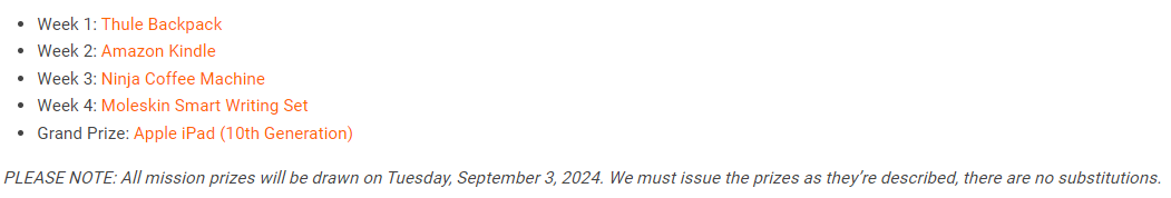 PLEASE NOTE: All mission prizes will be drawn on Tuesday, September 3, 2024. We must issue the prizes as they’re described, there are no substitutions.