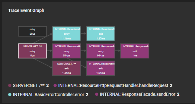 A trace event graph in SolarWinds Observability shows the entry and exit spans.