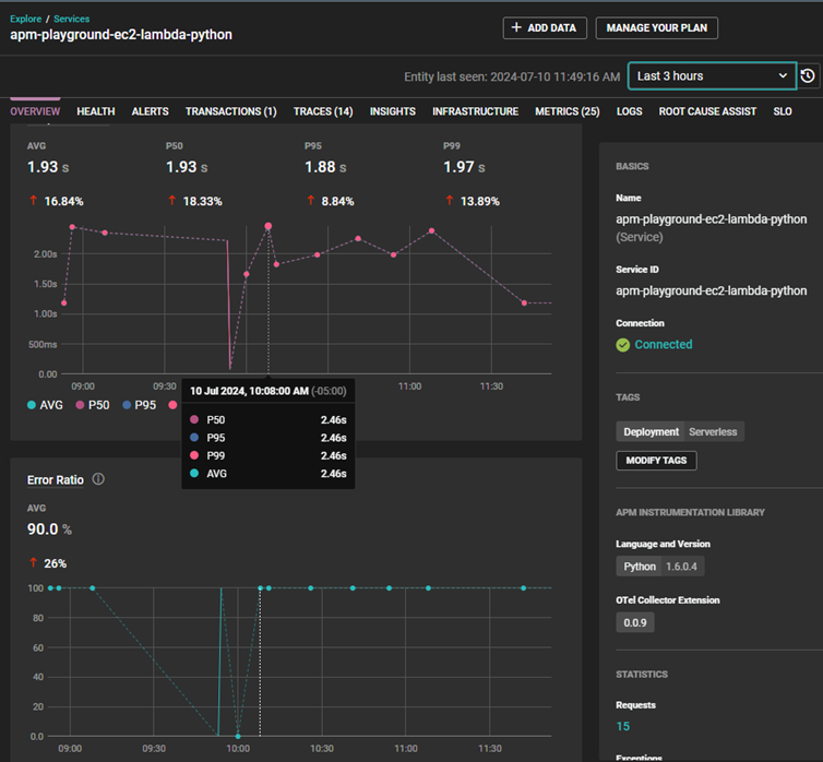For example, if a user reports the search function on a website is taking a long time or is failing to complete, you can open the services overview in SolarWinds Observability and look for changes in duration or error rates.
