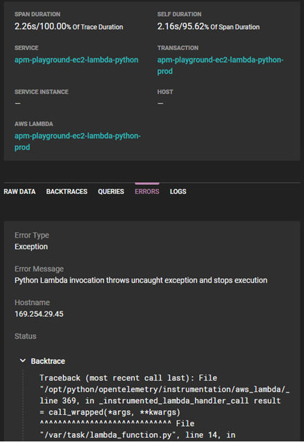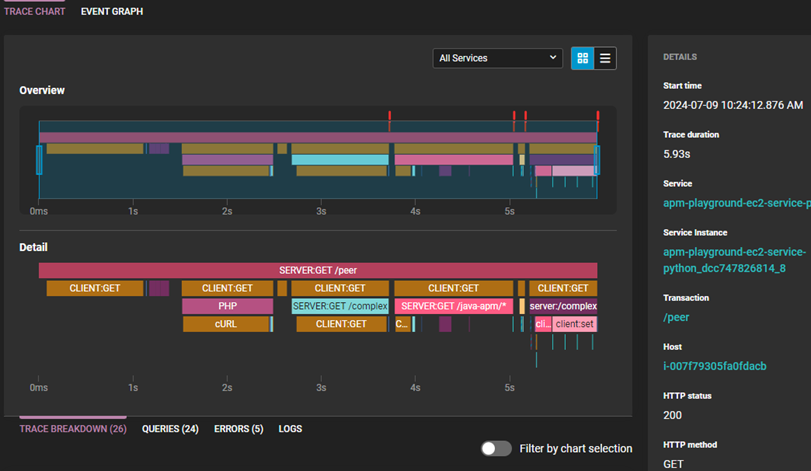 To view more details, you can select the span in the chart. By opening the tabs below the span duration, you can drill into the errors, look at the queries, and scroll through event data filtered by the trace ID.