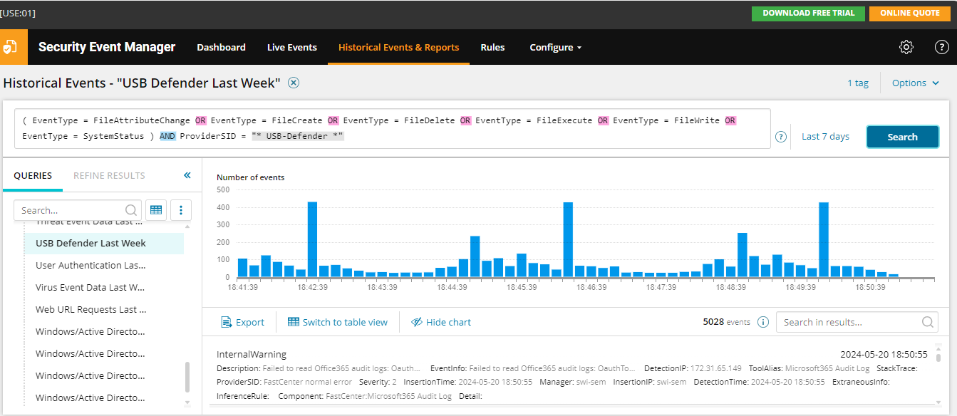 Security Event Manager (SEM) includes File Integrity Monitoring and USBDefender®, which can monitor for data exfiltration via file copies to a USB drive. SEM can even automatically detach the USB device if file copies are detected or detach it as soon as it's inserted into the machine. SEM can also audit URL requests to known file hosting/transfer and webmail sites, which may be used to exfiltrate sensitive data.