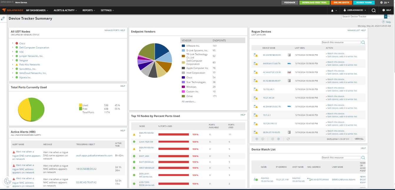 User device tracking in SolarWinds Hybrid Cloud Observability enables you to detect unauthorized devices on your wired and wireless networks. Information such as MAC address, IP address, and hostname can be used to create blocklists and watch lists. Hybrid Cloud Observability also provides the ability to disable the switch port used by a device, helping to ensure that access is removed.