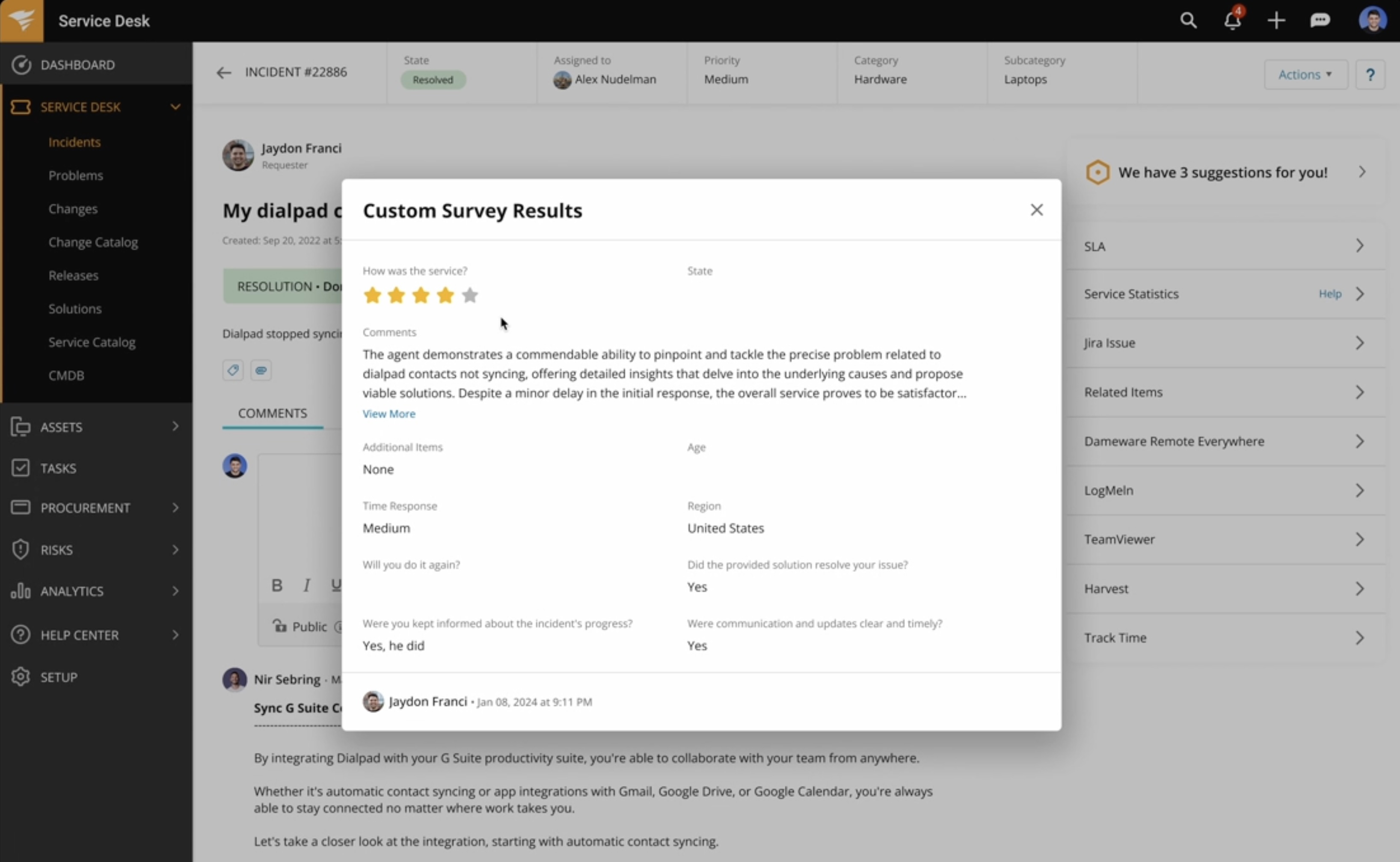 Global survey results are great for understanding the overall end-user satisfaction of service management teams, but the information is general to everyone who has submitted a survey. What if an agent or other team member wants to know an end-user's feedback for a specific incident? Now they can, with Custom Survey Results in Incidents.