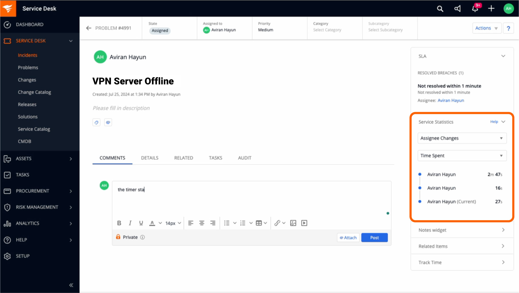 Service Statistics on Problem Records–which functions similarly to the existing feature, service statics available for incidents–provides detailed insights into the lifecycle of a problem in an easy-to-follow visual timeline, offering key metrics such as how long a problem remained open, the time taken for assignment, and the duration each assignee worked on it. These insights empower management to identify bottlenecks in problem resolution, helping to reduce turnaround times and improve service delivery. Additionally, these metrics can be leveraged for more accurate reporting and strategic resource allocation. For more information, see Incidents: Service statistics.
