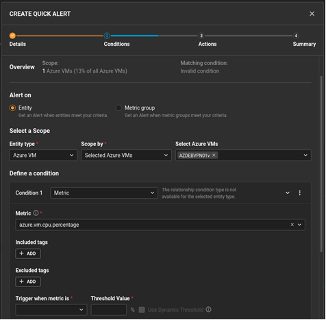 SolarWinds Observability SaaS lets you create alerts quickly and simply on metrics from VMs hosted by Azure to detect and notify you of common issues in virtual environments. You can create alerts manually on the Alerts Settings page by clicking Create Alert.