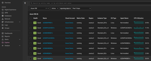 Within SolarWinds Observability SaaS, you can quickly access dashboards and visualizations for your Azure VMs. In addition to navigating through the Azure page of Infrastructure resources, you can also use Explorer and filter by entity type (set to Azure VM).