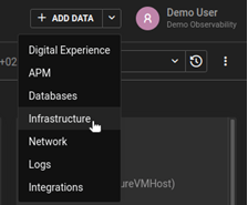 Then, click the Add Data button at the top in SolarWinds Observability SaaS. Select Infrastructure.