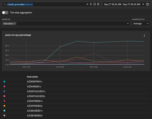 For example, you can visually compare CPU utilization across all Azure VMs by filtering down to cloud.platform:azure_vm and grouping metrics by host.name.
