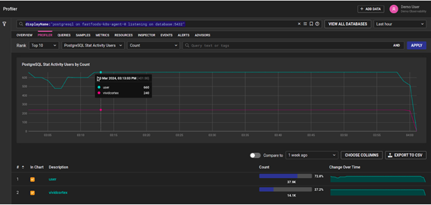 To keep track of users and services connected to a PostgreSQL server, navigate to the Profiler tab and select PostgreSQL Stat Activity Users in the filtering drop-down menu: