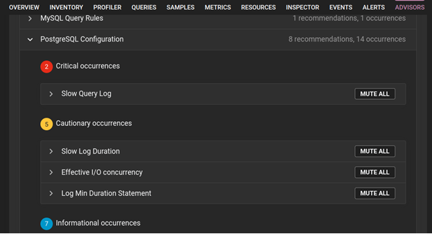 SolarWinds Observability also provides an Advisor feature that offers useful suggestions on how to optimize your PostgreSQL instances. This feature can save ample time spent on identifying improvements which can be spent on more effective tasks. To access it, navigate to the Advisors tab.