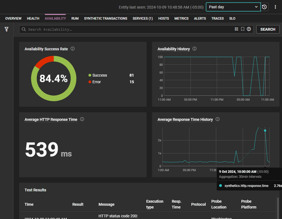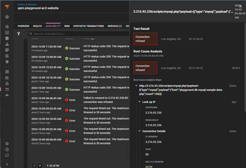 Digital Experience Observability is much more than availability monitoring. It enables you to quickly triage an alert to determine if there’s an issue. Then, with a series of clicks, it allows you to understand which synthetic transaction is behind the increase in the response rate and identify the poorly performing service call. Deep diving into the poorly performing service, you can run a trace and dig into the specific non-responsive database query or returning an error.