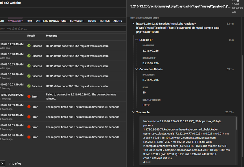Scrolling through the test results at the bottom of the dashboard, you can click on the failed tests to view the error message, the probe location, and the time stamp. In the same view, the automated root cause analysis details the individual steps of the transaction. From this view, you can quickly determine that the increase in the site response time is due to an issue with a PHP service call to the MySQL database. At the bottom of the root cause analysis view, you can see the entire traceroute of the service call and identify precisely where the connection was refused.
