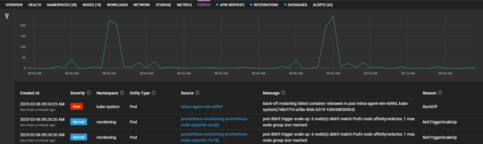 Event correlation and troubleshooting: Quickly detect failing pods, image pull errors, or scheduling issues by correlating Kubernetes events with performance metrics.
