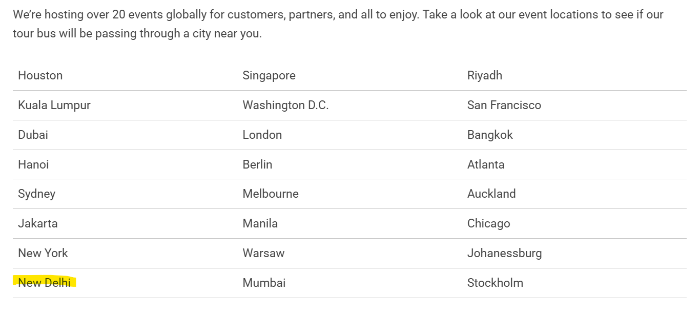 We’re hosting over 20 events globally for customers, partners, and all to enjoy. Take a look at our event locations to see if our tour bus will be passing through a city near you.