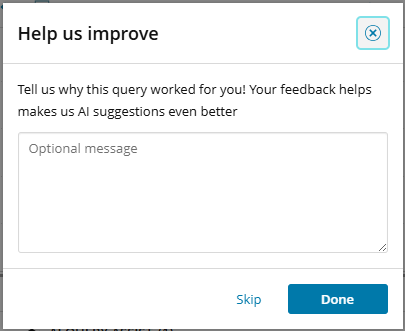 We want to hear your feedback on your experience with AI Query Assist’s query optimizations! Whether AI provides great suggestions or not, we want to know about it so we can work to improve the optimizations, or join you in celebrating your new optimized queries. Feedback can be provided by clicking the thumbs up/down icon and entering a note about the outcome.