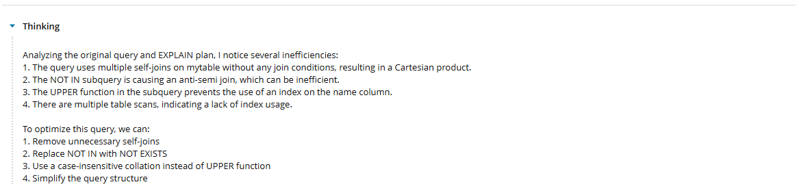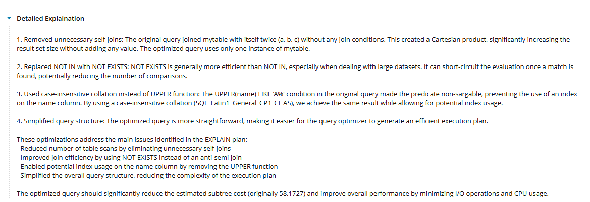 SolarWinds AI rewrites (aka optimizes) a query taking as input the SQL text along with an explain plan so it has insights into how the DBMS has chosen to execute the query. Note that DDL does not have plans, so DDL statements cannot be optimized. Optimization results include: