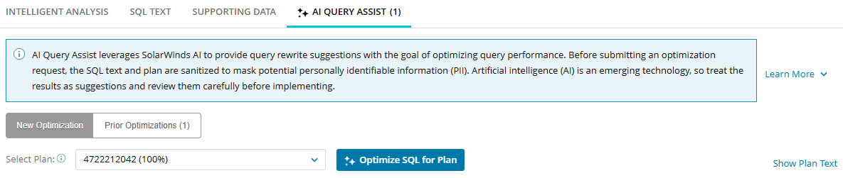 AI Query Assist leverages SolarWinds AI, which has been trained for SQL performance, to expertly rewrite queries with better performance while of course retaining functional equivalency. SolarWinds AI operates within a controlled environment, ensuring sensitive personally identifiable information (PII) remains fully masked and secure. AI Query Assist supports SQL Server query optimization for now, but expect broader DBMS support in future releases.